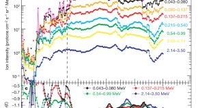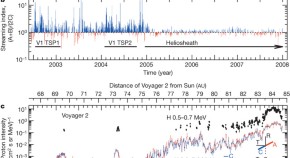 The supersonic (with respect to the interstellar medium) solar wind creates a heliospheric bubble around the Sun. A termination shock occurs where the wind abruptly slows and forms the heliosheath. Voyager 2 crossed the termination shock at 83.7 au in the southern hemisphere. The intensity of 4–5 MeV protons accelerated by the shock near Voyager 2 was three times that observed concurrently by Voyager 1, indicating differences in the shock at the two locations.