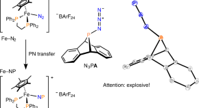 Precursors for the release of phosphorus mononitride in solution under mild conditions have remained elusive. Now, an explosive anthracene-stabilized azidophosphine has shown PN transfer reactivity in the synthesis of an Fe–NP complex. The PN ligand is N-bonded, as the Fe–N interaction shows significant covalent character and a less unfavourable Pauli repulsion than its Fe–P counterpart.