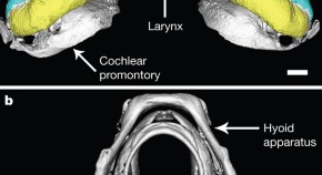 Echolocation is usually associated with bats. Many echolocating bats produce signals in the larynx, but a few species produce tongue clicks. Here, studies show that in all bats that use larynx-generated clicks, the stylohyal bone is connected to the tympanic bone. Study of the stylohyal and tympanic bones of a primitive fossil bat indicates that this species may have been able to echolocate, despite previous evidence to the contrary, raising the question of when and how echolocation evolved in bats.