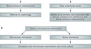 In this Review, authors from Stanford University discuss the differences between children and adults in the presentation and diagnosis of atraumatic, asymptomatic hematuria. In adults, evaluation focuses on distinguishing benign from malignant etiology. In children, by contrast, evaluation should focus on glomerular versus non-glomerular causes.