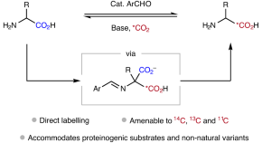 Carbon-labelled α-amino acids are valuable compounds in drug development and nuclear medicine, but are difficult and time consuming to prepare. Now, an aldehyde-catalysed method has been developed for the direct C1-labelling of α-amino acids using *CO2 (* = 14, 13, 11), providing access to many proteinogenic and non-natural labelled α-amino acids.