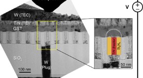 Applying in situ TEM techniques to GST-based vertical PCRAM cells, we directly observed the DC set switching process of real devices for the first time. The results show that the microstructure of crystalline GST matrix is an important structural parameter determining the local temperature distribution. In the case of highly crystallized GST matrix, the device failure occurred via two-step void formation due to the polarity-dependent electromigration.