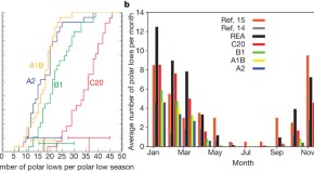 Climate change is often associated with an increase in the frequency of extreme weather events, such as heat waves or intense precipitation. Here, however, downscaled climate model simulations have been used to show that the frequency of North Atlantic polar lows — intense storms that are considerably smaller than the weather-dominating synoptic depressions — is projected to decrease by the end of the twenty-first century.