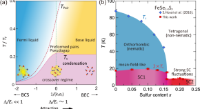• The BCS-BEC crossover is typically observed using ultracold atomic systems but recent experiments suggest investigations may also be possible using strongly correlated systems. Here, the authors use FeSe1−xSx to investigate the evolution of the superconducting state in the BCS-BEC crossover regime observing multiband nature of the BCS-BEC crossover with a suppression of the nematic order upon S-substitution.
