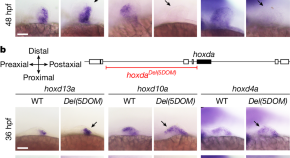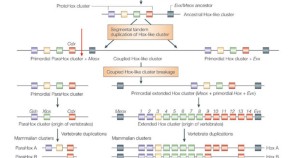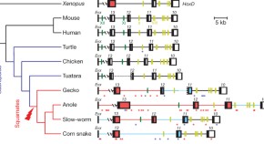 The organization of Hox clusters in several different reptiles is investigated, showing that the Hox clusters in squamates — lizards and snakes — have unexpectedly accumulated transposable elements, reflecting extensive genomic rearrangements of coding and non coding regulatory regions. Comparative expression analyses between two species showing different axial skeletons, the corn snake and the whiptail lizard, revealed major alterations in Hox13 and Hox10 expression features during snake somitogenesis, in line with the expansion of both caudal and thoracic regions.