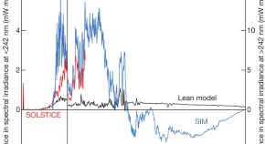 Radiative forcing over an '11-year' solar cycle is thought to be in phase with related influences on climate, but recent satellite data reveal a surprising spectral component in solar variability. These authors show that these spectral variations lead to decreases in ozone below 45 km and increases above. As a consequence, radiative forcing of surface climate is out of phase with solar activity, suggesting that a major revision of our current understanding of solar forcing of climate may be required.