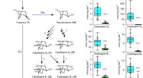 • Tropinone is an intermediate in the biosynthesis of tropane alkaloids. Here, the authors discovered the enzymes AbPYKS and AbCYP82M3, a non-canonical polyketide synthase and a cytochrome P450, that work sequentially to form tropinone from N-methyl-Δ1-pyrrolinium cation.