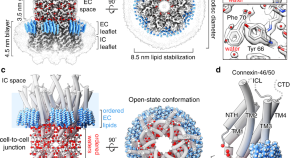 • The local lipid environment is known to affect the structure, stability and intercellular channel activity of gap junctions, however, the molecular basis for these effects remains unknown. Here authors report the CryoEM structure of Cx46/50 lipid-embedded channels, by which they reveal a lipid-induced stabilization to the channel.