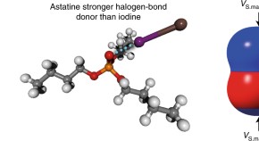 • Halogen bonding is known to get stronger with increasing halogen polarizability, but some trends of the periodic table break down for heavy elements owing to relativistic effects. Now, through distribution coefficient measurements and relativistic quantum mechanical calculations, AtI has been shown to form stronger halogen bonds than I2—meaning that astatine conforms to the trend.
