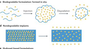 Long-acting drug delivery formulations enable sustained and prolonged drug release at the site of action or for systemic delivery, overcoming the need for frequent and repeated drug administration. This Review discusses US Food and Drug Administration (FDA)-approved long-acting drug delivery formulations, highlighting different slow-release mechanisms and delivery platforms, and the materials used to achieve them.