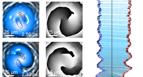 Phase vortices and skyrmions manifest as rotational entities in condensates, superfluids, and optics, typically revealed by the analysis of the Berry curvature. Via two-component microcavity polaritons, the authors imprint a dynamical pseudospin texture to the emitted light, generating a continuous vortex with two ultrafast spiraling cores.