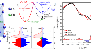 In FeRh, it is possible to optically drive a phase transition between ferromagnetic (FM) and anti-ferromagnetic (AFM) ordering. Here, using a combination of photoelectron spectroscopy and ab-initio calculations, the authors demonstrate the existence of a transient intermediate phase, explaining the delayed appearance of the FM phase.
