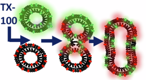 Detergent-induced membrane interactions are important for biotechnology applications but their mechanism is still not well understood. Here, sub-micron-sized vesicles are shown to fuse by a non-ionic detergent, involving permeabilization, vesicle docking, hemi-fusion, and full lipid mixing steps.