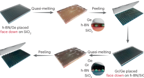 • A quasi-melting transfer technique enables clean, sequential transfer of graphene and hexagonal boron nitride monolayers from germanium substrates under vacuum conditions. Controlled lattice alignment yields atomically precise, wrinkle-free superlattices with tunable stacking and twist angles, enabling scalable fabrication of high-quality 2D heterostructures for advanced electronics.
