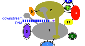 A backbone model of ten subunits of yeast RNA polymerase II has been derived from the ongoing analysis of its crystal structure. Notable features include ‘jaws’ for holding DNA, a putatively RNA-regulated ‘sliding clamp’, two ‘pores’ located in the vicinity of the catalytic center, and a high degree of similarity with the structure of a bacterial RNA polymerase.