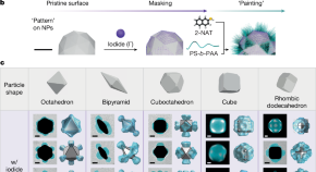• An atomic stencilling method based on the co-adsorption of iodide and 2-naphthalenethiol on gold is described, yielding more than 20 different types of nanoparticle with masked and painted regions and patchy particle morphologies not reported previously.
