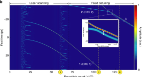 Molecules of solitons provide insight into fundamental interactions between them and the underlying nonlinear system. The reported heteronuclear molecules, comprised of dissipative solitons with distinct frequencies, temporal widths, and energies enter the multistability regime and yield in interlocked frequency combs.