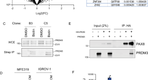 Lineage-restricted transcription factor PAX8 is oncogenic in ovarian cancer cells. Here the authors show that PAX8 interacts and recruits a splice variant of the MECOM locus PRDM3 to control the gene expression module involved in adhesion and extracellular matrix, and consequently promotes ovarian tumorigenesis.