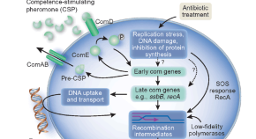 • Certain antibiotics prompt Streptococcus pneumoniae to take up DNA from the environment, which may enable the microbe to acquire genes for antibiotic resistance.