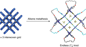 A combination of metal- and anion-template synthesis directs the weaving of molecular weft and warp strands in the assembly of a 3 × 3 interwoven grid. Connection of the ligand strands by alkene metathesis produces the topology of a seven-crossing endless knot, an important cultural and religious symbol.