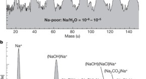 Saturn's moon Enceladus emits plumes of water vapour and ice particles from fractures near its south pole, raising the possibility of a subsurface ocean. Minor organic or siliceous components, identified in many ice grains, could be evidence of interaction between Enceladus' rocky core and liquid water; however it has been unclear whether the water is still present today or if it has frozen. Now, the identification of a population of E-ring grains that are rich in sodium salts suggests that the plumes originate from liquid water.