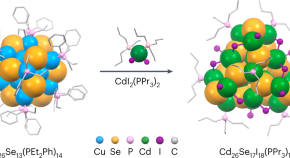 Atomic-level control of semiconductor nanomaterials remains difficult due to their complex structures. Now, a programmable approach to synthesize a series of precisely defined Zn14Se13, Cd14Se13 and Hg14Se13 clusters is reported, and the origin of their atom-like wavefunctions and distinct doublet absorption features is examined.