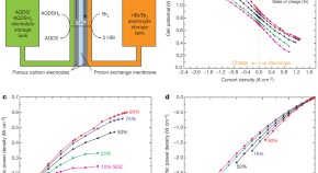 Flow batteries, in which the electro-active components are held in fluid form external to the battery itself, are attractive as a potential means for regulating the output of intermittent renewable sources of electricity; an aqueous flow battery based on inexpensive commodity chemicals is now reported that also has the virtue of enabling further improvement of battery performance through organic chemical design.