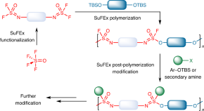 Sulfur(vi) fluoride exchange (SuFEx)—a type of click chemistry that generates SVI-centred covalent linkages—has previously been used for polymer synthesis. Now, modular SuFEx polymerization using SOF4 has been used to generate helical polymers. Unlike previous examples of SuFEx polymerization, the backbone retains SVI–F motifs and therefore is able to undergo further SuFEx click reactions, enabling facile and efficient post-polymerization modification.
