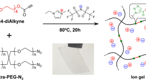 (2 × 4)-Type tetra-PEG ion gels were prepared through a copper-free azide–alkyne cycloaddition reaction between tetra-branched poly(ethylene glycol) and linear tetra(ethylene glycol). The tensile tests showed that the reaction efficiency of the cross-linking was over 90%. The prepared ion gels exhibited high mechanical toughness and stretchability characteristic of tetra-PEG gels. The electrochemical window of the ion gels was the same as that of the ionic liquid inside the gel. The ionic conductivity of the ion gel (30 wt% polymer concentrations) was 8.9 × 10−4 S cm−1 (25 °C, anhydrous conditions).