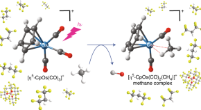 Catalytic transformations of methane frequently involve the formation of a metal–methane complex, but these compounds are challenging to observe. Now, a relatively long-lived osmium–methane complex has been characterized using NMR spectroscopy and forms from the direct binding of methane to a photolytically generated, coordinatively unsaturated cationic osmium–carbonyl complex dissolved in an inert hydrofluorocarbon solvent at –90 °C.