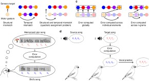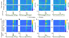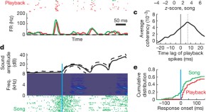 Living in noisy colonies, songbird vocal learning requires individuals to differentiate self-generated vocalizations from other sound sources to accurately match the learned song template. However, neurons responding to vocal output have not been identified. This study identifies neurons in the auditory forebrain of zebra finch that specifically responded to either song or playback perturbations, suggesting the existence of a computational error-checking function in the forebrain auditory areas.