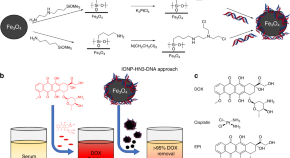 Chemotherapy agents are prone to producing severe side-effects, and their sequestration prior to their entering of the circulatory system is thus highly desirable. Here, the authors functionalize iron oxide nanoparticles with genomic DNA and achieve sequestration of doxorubicin, cisplatin, and epirubicin from biological solutions.