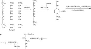 Three C21-based reactive polyamides with various amine values as epoxy-curing agents were synthesized from tung oil and different polyamines. It was found that the cured materials were superior to those cured by widely used C36-based polyamides with regard to mechanical properties. The glass transition temperatures of three cured C21-based polyamides were found to be higher than that of C36-based polyamides. The curing kinetics were studied and nonisothermal DSC curves show a good agreement with theoretically calculated ones.