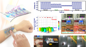 A transparent stretchable (TS) capacitive sensor, which can detect pressure (force) and touch inputs distinguishably was fabricated by forming with a TS dielectric layer sandwiched between the upper piezoresistive electrode of poly(3,4-ethylenedioxythiophene):poly(styrenesulfonate)–ionic liquid composite enabling to distinguish touch and pressure stimuli and the lower TS electrode of metal/indium tin oxide/metal multilayer on a transparent elastomeric substrate with stress-relieving three-dimensional microstructured pattern providing multi-directional stretchability and high pressure sensitivity. The TS sensor array demonstrated a good control of the interaction with a small vehicle as a multi-functional input device for future wearable electronics.
