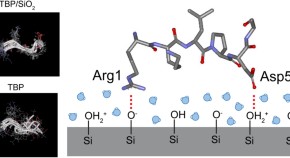 Saturation transfer difference (STD) NMR analysis was performed to identify the titanium-binding peptide (TBP) sites that interact with the SiO2 nanoparticle surface, and then Arg1 and Asp5 were identified to be in close contact with the surface. The structure of the TBP bound to SiO2 determined by the NOESY measurement was well defined, and the Arg1 and Asp5 side chains face in the same direction. These results validates that the NH2+ of Arg1 and the COO− of Asp5 interact electrostatically with the SiO− and SiOH2+ on the SiO2 surface, respectively.