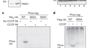 Ubiquitin, known for its role in post-translational modification of other proteins, undergoes post-translational modification itself; after a decrease in mitochondrial membrane potential, the kinase enzyme PINK1 phosphorylates ubiquitin at Ser 65, and the phosphorylated ubiquitin then interacts with ubiquitin ligase (E3) enzyme parkin, which is also phosphorylated by PINK1, and this process is sufficient for full activation of parkin enzymatic activity.