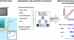 • This study quantifies the relative contributions of material crystallinity and environmental factors to the marine degradation rate of poly(ε-caprolactone) (PCL). PCL sheets with controlled crystallinity were exposed at six Japanese coastal locations for 6–15 months. Machine learning regression (CatBoost, R² = 0.60) combined with SHAP analysis revealed that water temperature contributed most strongly to degradation rate variation, followed by depth and total nitrogen, while crystallinity showed moderate influence. These findings demonstrate that environmental conditions substantially drive degradation rate variability in realistic marine settings, providing insights for field-relevant material design and environmental compatibility assessment.