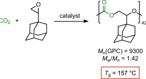 To synthesize CO2-derived polycarbonates with high Tg values, epoxides having rigid and bulky 2-norbornyl or 1-adamantyl substituents were selected as comonomers. The alternating copolymer obtained from 1-adamantylethylene oxide showed a Tg above 150 °C. This is the highest Tg among those observed for alternating copolymers obtained from CO2 and a terminal epoxide.