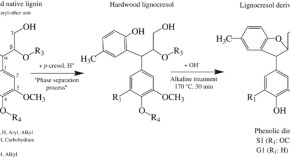 Hardwood lignin in eucalyptus was first converted to hardwood lignocresol through a phase separation process utilizing wood meal, sulfuric acid, and p-cresol at ambient temperature. A syringyl methyl benzofuran, S2 was selectively obtained via a syringyl-type phenolic dimer with a coumaran ring, S1 by NaOH treatments of hardwood lignocresol at 170 °C. Our process controls the reactivity of Cα linkages, Cβ-aryl-ethers, and Cγ-OH in sequence, successfully resulting in a high yield of specific aromatic chemicals from hardwood lignin based on the successiveness of Cβ-aryl-ethers between syringyl units.