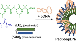 A new peptide carrier that mimics the basic leucine zipper domain (bZIP) of DNA-binding proteins was designed, in which (LU)4 is the leucine zipper motif and (KUA)3 is the basic DNA-binding motif (U = α-aminoisobutyric acid). When mixed with pDNA, (KUA)3-(LU)4 peptide condensed DNA molecules to form nanoparticles. Furthermore, when complexes of the (KUA)3-(LU)4 peptide and pDNA were introduced into the leaves of Arabidopsis thaliana (A. thaliana), the reporter protein was expressed in plant cells. Thus, (KUA)3-(LU)4 is an efficient carrier of pDNA with high dissociation efficiency.