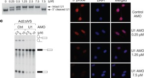 Splicing is carried out by a collection of protein–RNA complexes known as snRNPs. The spliceosome contains equal quantities of the U1, U2, U4, U5 and U6 snRNPs, but the U1 snRNP is made in levels excess to the amounts needed to form spliceosomes, leading to the idea that excess U1s might have splicing independent functions. Here it is shown that the U1 snRNA interacts with some pre mRNAs whose introns have cryptic polyadenylation sites. This interaction prevents premature termination and polyadenylation of the pre mRNA.