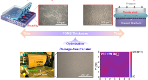 The mechanisms involved in the damage of CVD-grown graphene (Gr) and MoS2 are investigated during a roll-based transfer process. We identify two different damage mechanisms, i.e., instability-induced damage and tensile strain-induced damage. The two mechanisms compete, depending on the thickness of the transfer medium, and induce dissimilar damage. By optimizing the thickness, we realize and demonstrate the damage-free transfer of 2D materials. The sheet resistance and mobility of transferred Gr are 235 ± 29 Ω sq–1 and 2250 cm2 V–1 s–1, respectively, with no microscopic cracks or tear-out damage.