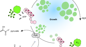 Active coacervate droplets are droplets coupled to a chemical reaction that maintains them out of equilibrium, which can be used to drive active processes, but coacervates are still subject to passive processes that compete with or mask growth. Here, the authors present a nucleotide-based model for active coacervate droplets that form and grow by fuel-driven synthesis of ATP, and, importantly, do not undergo Ostwald ripening.