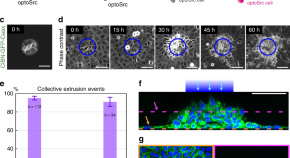 To study the onset of carcinogenesis, the authors use an optogenetics approach to selectively activate with light the Src oncoprotein in cells of an epithelium with a good control in time and space. The transformed cells collectively extrude as a tridimensional aggregate from the cell sheet while remaining alive and in parallel cells of the monolayer converge toward the locus of extrusion.