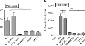 The Lpp lipoproteins of staphylococci trigger a TLR2-dependent immune response. Here, the authors show that commensal species (S. aureus, S. epidermidis) induce a less-intense TLR2 response than non-commensal species (S. carnosus) due to differential modification of the Lpp lipid moieties.