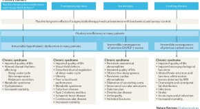 Despite effective treatments for pituitary tumours, chronic syndromes can occur in patients during long-term follow-up. This Review describes these syndromes, which result from the effects of the initial disease, such as hormonal excess or pituitary insufficiency, and the effects of treatment modalities.