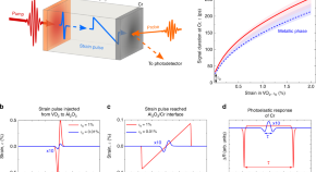 • Ultrafast driving of vanadium dioxide can induce a large structural phase transition, which can be used to generate picosecond strain pulses. Here the authors show that the photo-induced phase transition can contribute 0.45% strain without causing undesirable heating.