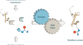 A method for engineering chemically modified proteins has now been developed using a chemoenzymatic cascade of sortase-mediated transpeptidation and protein trans-splicing. Using this one-pot approach enabled the generation of site-specifically modified proteins in vitro and in isolated cell nuclei.