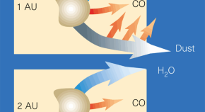 When comet Hale-Bopp is twice as far from the Sun as is the Earth it releases water and carbon monoxide (CO). As it passed very close to the Sun last year, even more CO was produced in the cometary atmosphere known as the coma. The fact that this extra source of CO switched on and off at a certain distance from the Sun suggests that a thermal production process may be involved.
