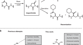 • Aspartimide formation is a frequently occurring problem during peptide synthesis. Here, the authors present cyanosulfurylides as a protection group that masks aspartic acid residues during solid phase peptide synthesis, thus preventing aspartimide formation, and can be removed with N-chlorosuccinimide.